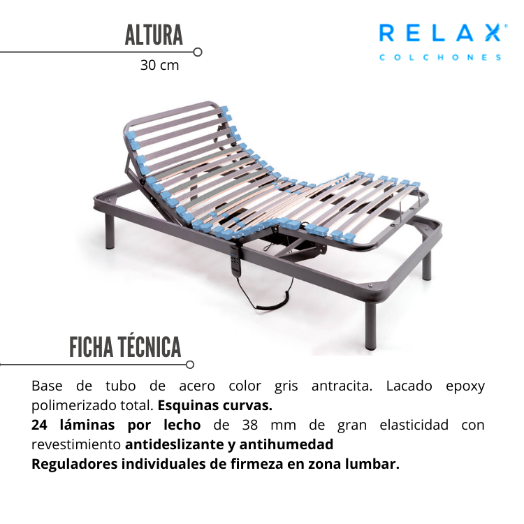 3 AÑOS de garantía en tu SOMIER ARTICULADO de RELAX: Cumple con las medidas de seguridad e higiene en sus materiales. Cuenta con garantía por cualquier problema de fabricación, nunca por su uso y su desgaste normal del somier articulado.