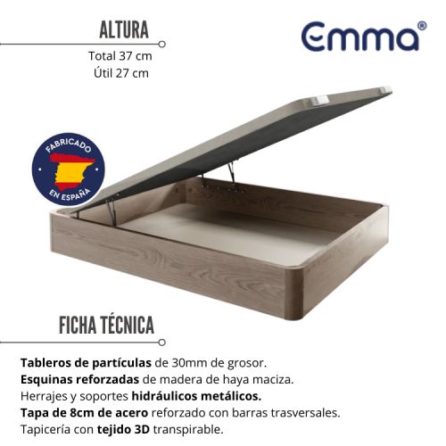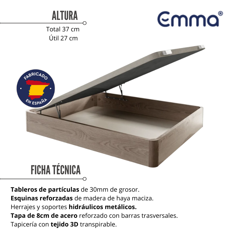 El canapé abatible EMMA tiene una altura total de 37 cm y cuenta en su interior con un espacio útil de 27 cm para almacenar lo que quieras a la vez que te proporciona un soporte al colchón lo que hace una combinación perfecta para tu descanso. La tapa reforzada está hecha de un tablero de acero (8 cm de grosor) reforzado con barras trasversales y tapizada en tejido 3D anti deslizante, además de darle transpirabilidad para un colchón viscoelástico de alta densidad, proporcionará aún mayor firmeza en cuanto a la sensación de la tumbada.