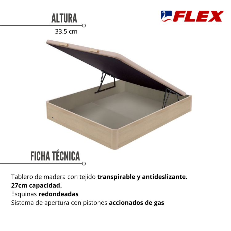 La capacidad del Canapé Madera 19 de Flex es de 33.5 cm en el exterior, ofreciendo un amplio espacio de almacenamiento con una capacidad útil interior de 27cm. Este versátil arcón abatible está disponible en una variada paleta de colores.