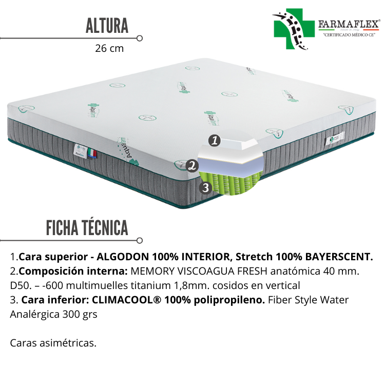 Adéntrate en el universo del descanso redefinido con el colchón Aquafarm hybrid de Farmaflex. Este modelo revolucionario, conocido como el sistema de 600 muelles ensacados titanium, destaca por su diseño exclusivo de disposición vertical en forma de panal. Más allá de ser simplemente un colchón, Aquafarm se erige como una obra de ingenieria para brindar la maxima comodidad. La incorporación de la aleación de Titanio en los 600 muelles no solo garantiza flexibilidad y adaptación al cuerpo, sino que también ofrece una articulación sin igual, perfecta para cualquier tipo de cama articulada. Descubre el toque distintivo de la aleación de Titanio, mejorando la durabilidad total, reduciendo el peso y retrasando la oxidación elevando así la claridad de tu descanso.