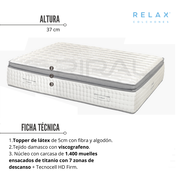 La fabricación de este colchón sigue la mayor tecnología gracias a la combinación de sus componentes con otros sumamente innovadores. El colchón Gran Reference de Relax es muy confortable por la adaptación de los muelles al peso del cuerpo y a su topper de látex que ofrece una sensación nube.