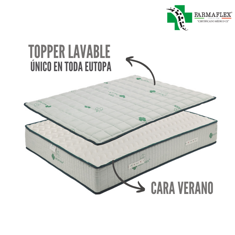 El colchón Medifarm Hybrid cuenta con Tejido elástico Strech 100% BAYERSCENT que permite un descanso reparador sin provocar rozamientos al dormir y en contacto con la piel con tratamiento CLIMACOOL System de 100% polipropileno que produce un aumento de la temperatura en invierno y un mantenimiento frío durante el verano. También incluye el único topper lavable que puede ser retirado gracias a su cremallera en los meses de verano o para una sensación más firme por su gran adaptabilidad al cuerpo.