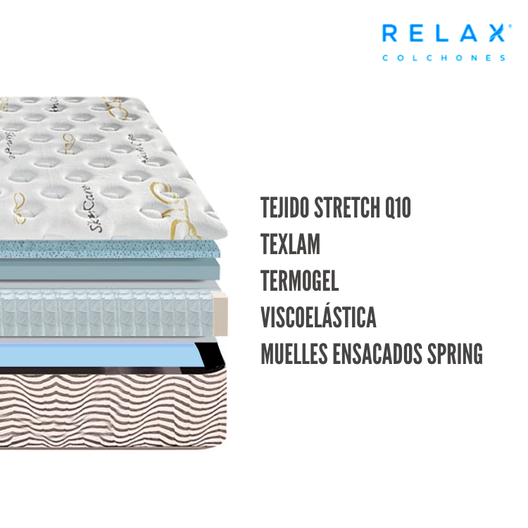 El colchón Q10 Spring de Relax cuenta con termogel. Es material innovador que está preparado para adaptarse perfectamente a la anatomía humana. Este material incorpora un gel que dificulta la absorción del calor generado por el cuerpo humano y mantiene la temperatura interior del colchón independiente.