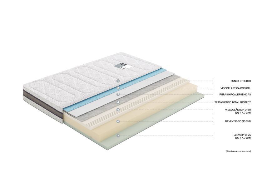 El colchón está recubierto con Tejido Stretch con tecnologia Optigrade, es decir, un tejido con tratamiento termoregulador que ayuda a disipar la temperatura a la hora de descansar. Tambien cuenta con un bloque viscoelastico con gel, que tiene todas las ventajas de la viscoelastica con particuas de gel incorpaoradas, lo que proporciona un mayor frescor durante el descanso