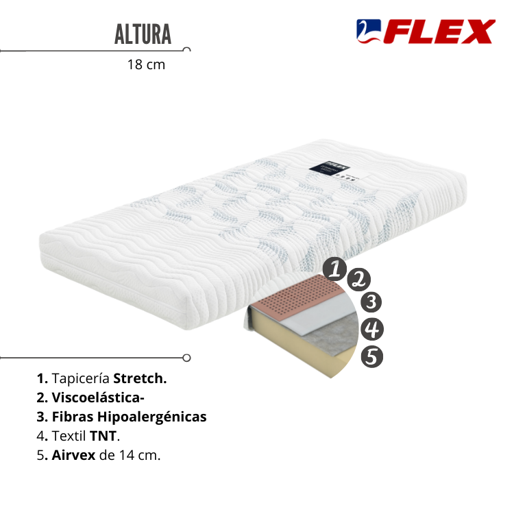 El colchón TEKNIA VISCO de FLEX cuenta con un bloque AirVex, viscoelastica con rellenos hipoalergenico. .Además incluye varios canales de aireación que hacen que el núcleo respire de manera natural mejorando sus propiedades de ventilación que le dotan de una firmeza adaptable ademas de unas cualidades ergonomicas e higienicas ecelentes.