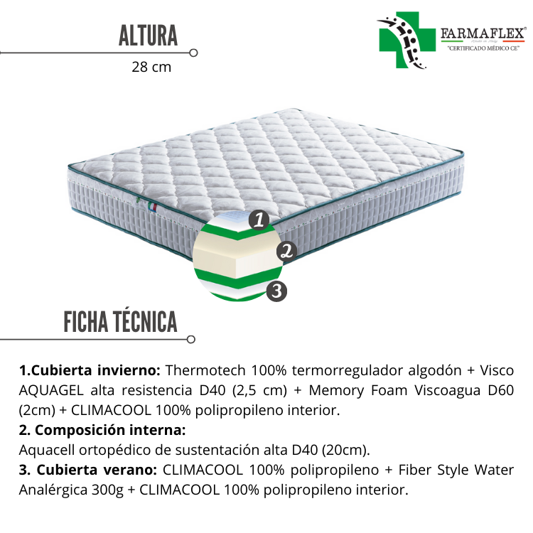 El bloque del colchón VISCOFARM está compuesto por una espuma AQUACELL oropédico de sustentación de alta densidad (40kg) y 20 cm de espesor. Este colchón está dotado dentro de la gama ortopédica aquacell con capas perfiladas y perforadas waterlily de 3 a 5 zonas de descanso para ofrecer una gran resistencia y adaptabilidad, principalmente en la zona de los lumbares, dorso, cervical y hombros. Dependiendo de la complexión de cada persona se necesitará mayor o menor adaptabilidad. Aparte de la comodidad que ofrecen estos colchones gracias a sus materiales, les hace diferenciarse del resto de viscoelásticos por su perfecta ventilación gracias a sus núcleos celulares con un sistema de perforaciones que permiten que sea anti alérgico, fresco e higiénico para disfrutar del mejor descanso.colchones farmaflx, colchones con certificado médico, colchon CLIMAFARM de farmaflex