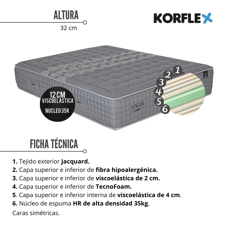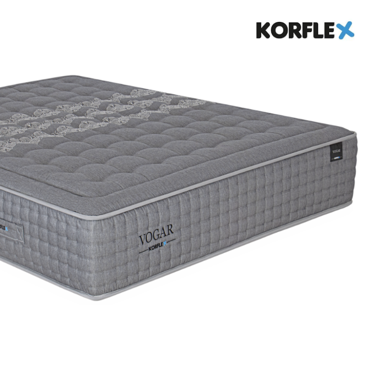 El colchón Vogar de Korflex cuenta con núcleo espuma de alta densidad HR de 35 Kg por metro cúbico de material, lo que le proporcionan una rigidez constante por todo el colchón y una independencia de lechos total sin transmisión de movimientos.