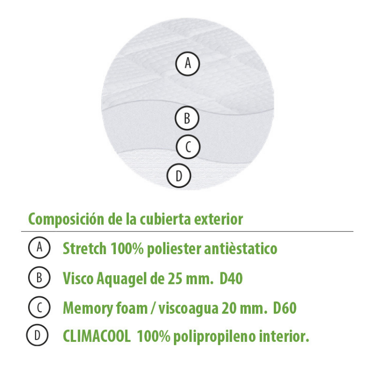 - CARA EXTERIOR : Tejido Stretch 100 % poliester antiestático+ VISCO AQUAGEL de 25 mm en D40 + MEMORY FOAM VISCOAGUA 20 mm en D60 + CLIMACOOL 100 % polipropileno interior