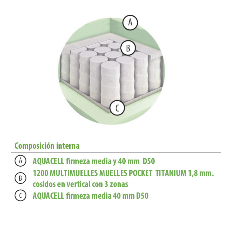 - Bloque con ACUACELL firmeza media de 40 mm en D50 + 1.200 MULTIMUELLES POCKET SIMMONS TITANIUM 1,6 mm cosidos en vertical con 3 ZONAS + AQUACELL firmeza media de 40 mm en D50
