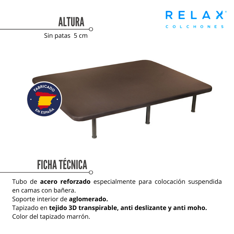 La base tapizada FORTE de RELAX es la mejor opción para usar como base suspendida en tu cama con bañera o bancadas y sustituir los somieres de láminas que proporcionan menor firmeza a nuestros colchones.