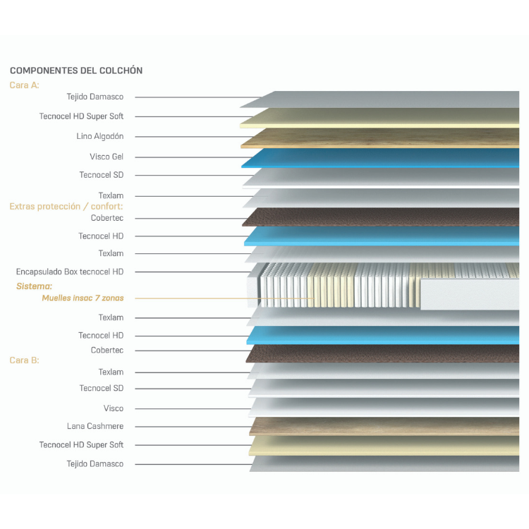 COMPONENTES INTERIORES: ACOLCHADO CON VISCO - LANA CASHMERE y LINO - FIBRA - TECNOCEL AIR PLUS