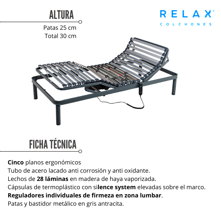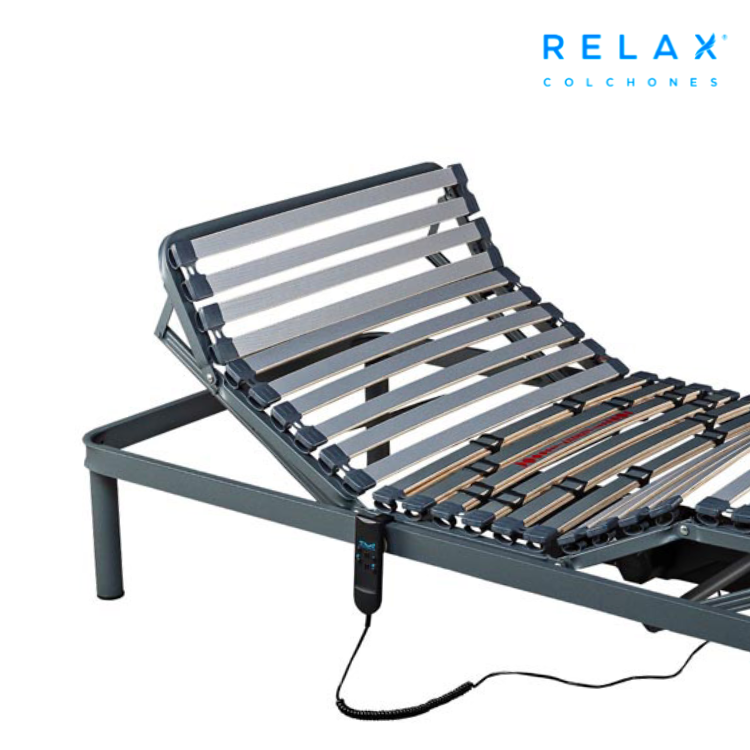 Los lechos de la cama articulada de RELAX cuenta con 27 láminas de madera de haya vaporizada de alta elasticidad y anti ruido con refuerzo de firmeza lumbar regulable. El motor de esta cama está homologado por la CE, con silence System y corriente continua de baja tensión de(220v-50/60Hz).