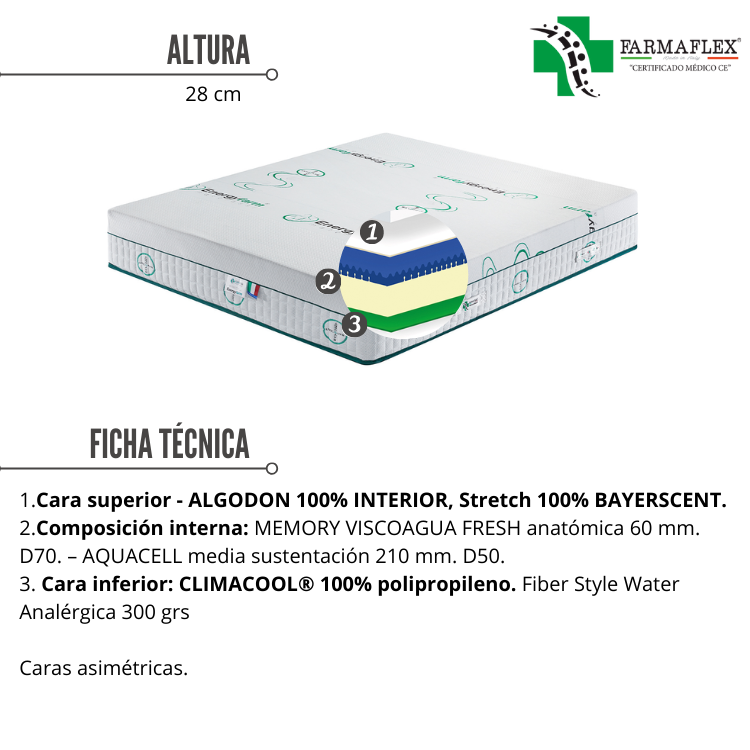 La marca Farmaflex trabaja con sus colchones viscoelásticos con espumas fabricadas al agua sin que ejerzan presión sobre el cuerpo para un mejor descanso. Este modelo  cuenta con un certificado médico (única marca en el mundo) de adaptabilidad anti presión en lumbares y cervicales por el ministerio de la salud CE con número de dispositivo-certificado médico: 1811930 / 1175.