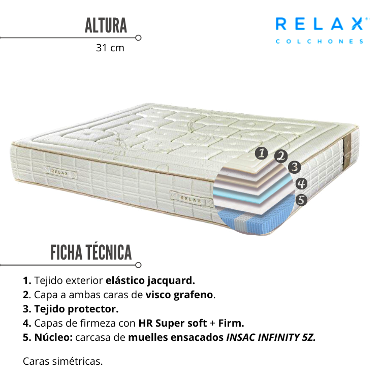 Este Gaviota Oro cuenta con una composición interior simetrica en ambas caras, lo que permite voltearlo cada seis meses para prolongar su durabilidad y mejorar el descanso durante años. Sus capas interiores de ciscoelástica con grafeno brindan una acogida insuperable y el grafeno ayuda a disipar el calor de manera eficiente. También cuenta con una capa HR Super soft, para una amortiguación más ligera y otra HR Firm de alta densidad para soportar el peso y aportar estructura al colchón