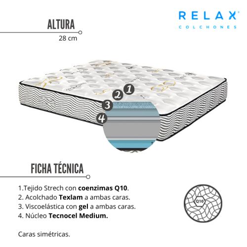 El colchón Q10 Elyo de Relax cuenta con termogel. Es material innovador que está preparado para adaptarse perfectamente a la anatomía humana. Este material incorpora un gel que dificulta la absorción del calor generado por el cuerpo humano y mantiene la temperatura interior del colchón independiente.