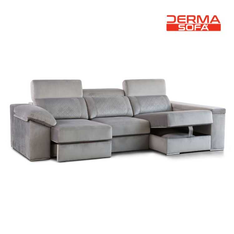 El modelo Oporto está fabricado con una estuctura de madera de pino macizo, reforzada con escuadras y laterales de aglomerado prensado. Los asientos acolchados de espumas de 32kg + Espuma Super suave (4cm) son deslizantes a suelo, gracias a su mecanismos de tubo metálico con apoyo frontal. El respaldo del sofá relleno de gomaespuma es reclinable, al igual que los cabezales con carraca cromada multiposición y espuma super suave de 22 kg y riñoneras rellenas de fibra siliconada 100%. Este modelo de sofá chaise longue viene de serie con arcón en chaise longue, patas metálicas cromadas delanteras y cojines decorativos a juego con el tapizado.