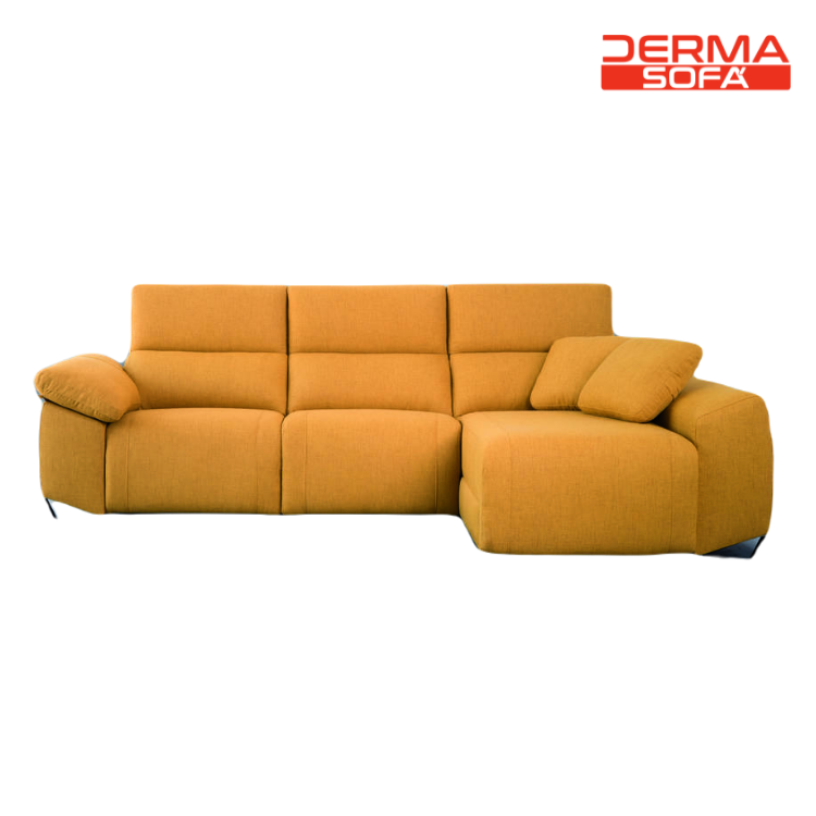 Tanto el respaldo del sofá como la cabecera son reclinables de goma supersuave y riñonera de fibra siliconada 100%. Este modelo de sofá chaise longue viene de serie con 2 patas delanteras metálicas y cojines en chaise longue.
